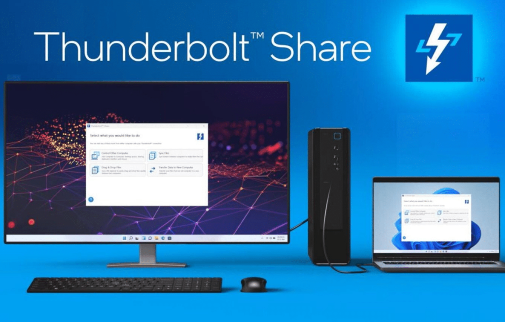 كشفت إنتل عن Thunderbolt Share، وهي تقنية تستخدم النطاق الترددي المتوفر من منافذ Thunderbolt 4 و Thunderbolt 5 لمشاركة البيانات ومزامنتها والتحكم في جهازي حاسوب باستخدام لوحة مفاتيح وفأرة واحدة.