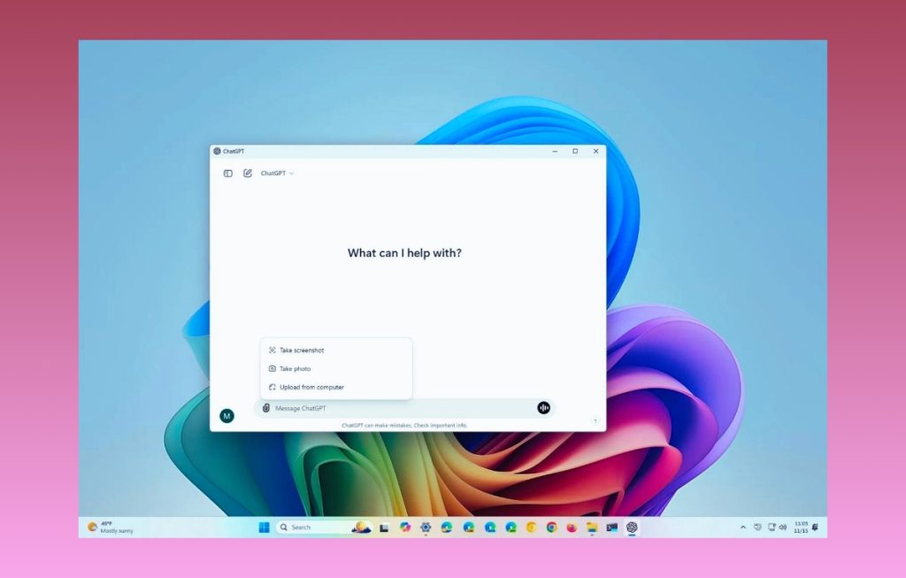 مزية أخرى لتطبيق ChatGPT الخاص بحواسيب ويندوز الخيارات الإضافية لتحميل الصور وتحليلها. على سبيل المثال: في إصدار الويب من ChatGPT يمكنك فقط تحميل الملفات على الويب، ولكن عند استخدام تطبيق ChatGPT الخاص بحواسيب ويندوز يمكنك أيضًا أخذ لقطات شاشة أو التقاط صور باستخدام كاميرا الويب وتحميلها، وطرح مطالبة خاصة بها.