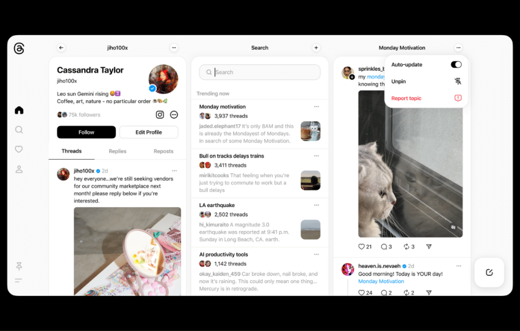 بدأت ثردز باختبار تجربة تشبه TweetDeck، مما يسمح لمستخدمي المنصة بإنشاء خلاصات قابلة للتخصيص ومكدسة في واجهة عمود عبر نسخة الويب، بطريقة تشابه TweetDeck قبل أن تصبح خدمة مدفوعة مع تغيير علامتها التجارية في العام الماضي.