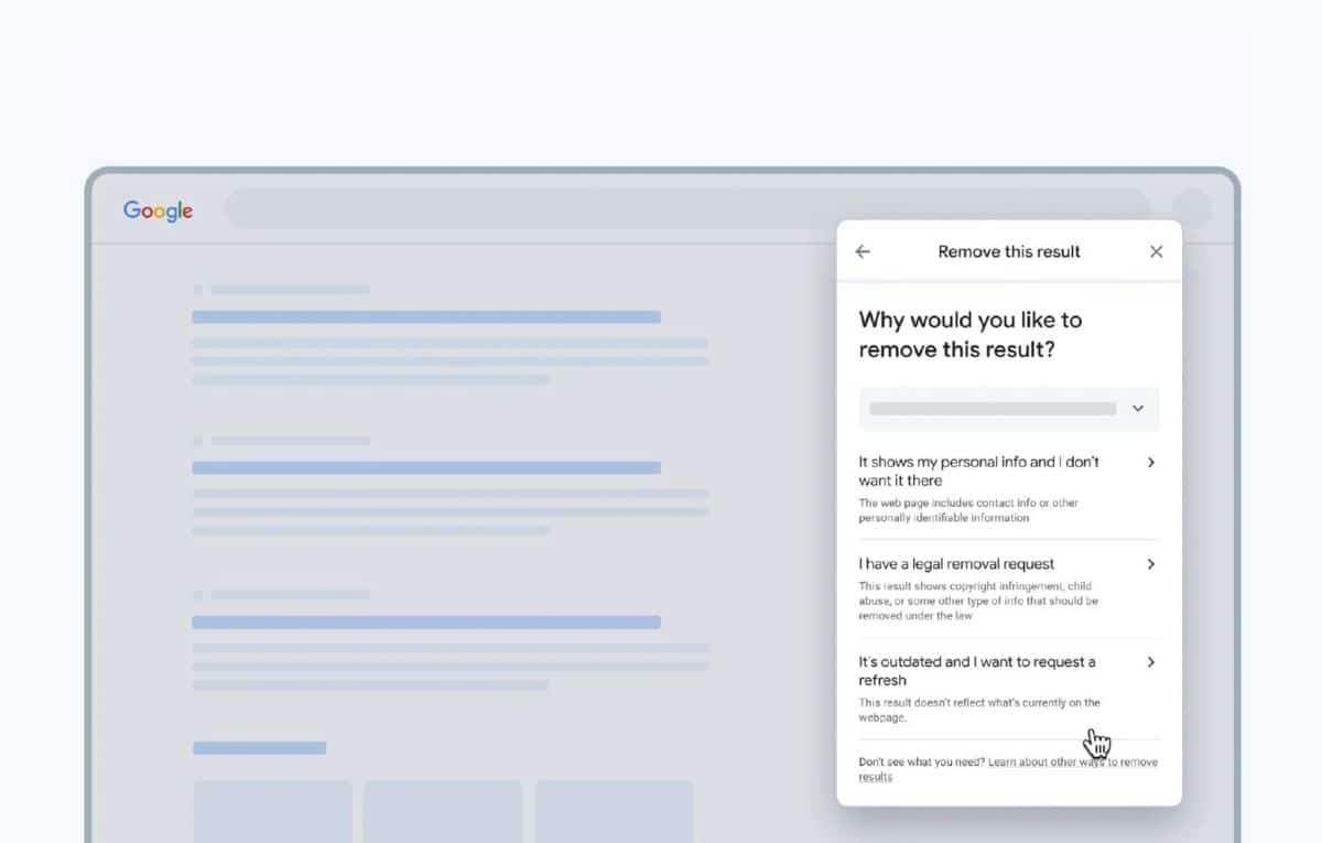 وعند طلب الإزالة، تظهر للمستخدم ثلاثة خيارات رئيسية، وهي “إزالة المعلومات الشخصية”، مثل المحتوى الذي يُستخدم في التشهير أو الكشف غير المصرح به عن البيانات، أو “طلبات الحذف القانونية”، التي تشمل انتهاك حقوق النشر أو المحتوى غير القانوني، أو “تحديث نتائج البحث القديمة”، وهي ميزة جديدة تتيح للمستخدمين إبلاغ الشركة بإعادة فحص المواقع إذا حدّثت بياناتهم أو حُذفت من المصدر دون أن ينعكس ذلك في نتائج البحث.