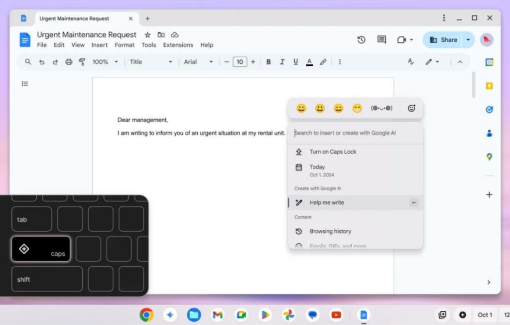 تضيف جوجل زر الإدراج السريع المتعدد الوظائف المخصص لوظائف الذكاء الاصطناعي إلى أجهزة كروم بوك. ويعمل الزر بصفته مفتاح Caps، ويفتح قائمة جديدة مع إمكانية الوصول إلى أداة Help me write التي يدعمها Gemini، والبحث عن الرموز التعبيرية وصور GIF، وسجل التصفح الأخير لنسخ الروابط بسرعة، والبحث المتكامل في Google Drive، والأدوات لإجراء حسابات سريعة، …