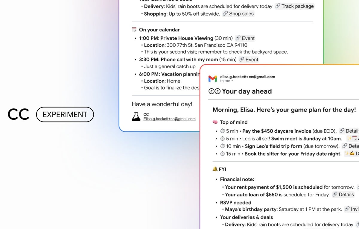 وبحسب جوجل، فإن “CC” يعمل بالتكامل مع نموذج Gemini، وهو يجمّع جدول اليوم والمهام الأساسية والتحديثات المهمة في ملخص واحد واضح يساعد المستخدم في معرفة ما ينبغي إنجازه لاحقًا. ويُرسل هذا الملخص، الذي يحمل عنوان “ما ينتظرك اليوم Your Day Ahead”، مباشرةً إلى بريد Gmail كل صباح.