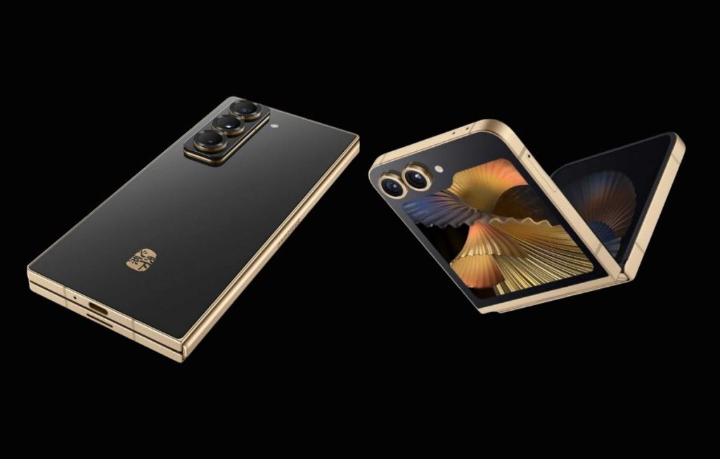 ويأتي كلا الهاتفين بتصميم أنيق يتميز بجهة خلفية سوداء من السيراميك، وإطار ذهبي من الألمنيوم، وآلية طي مُحسّنة.