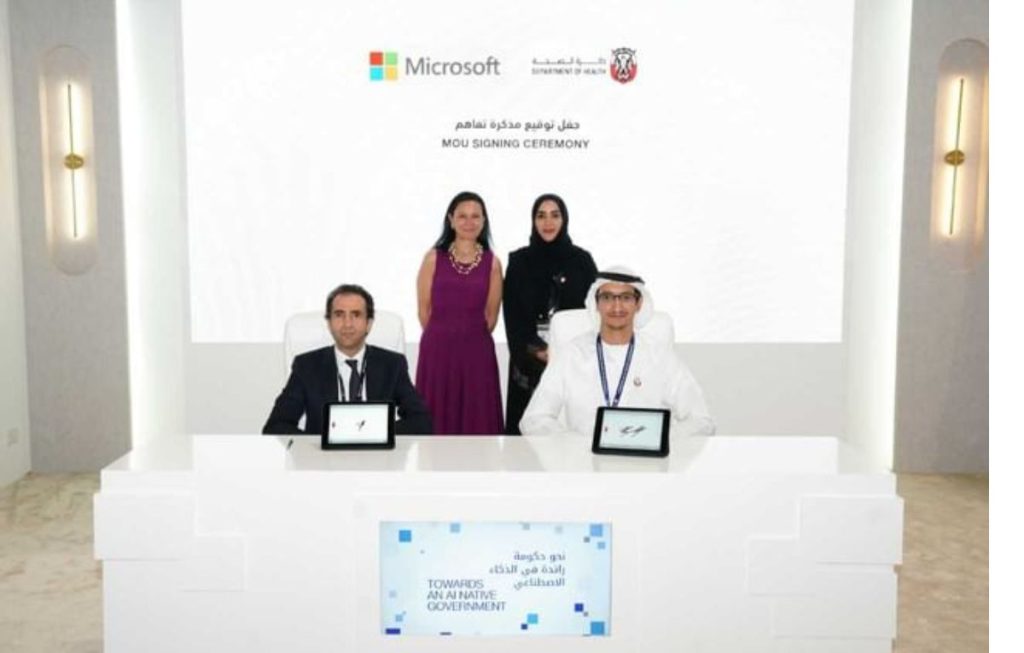 وبحضور سعادة الدكتورة نورة خميس الغيثي وكيل دائرة الصحة في أبوظبي وقع مذكرة التفاهم كل من إبراهيم الجلاف المدير التنفيذي للصحة الرقمية في دائرة الصحة في أبوظبي ونعيم يزبك مدير عام شركة مايكروسوفت الإمارات.