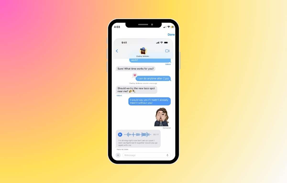 وفي نظام iOS 17 أضافت آبل مزية جديدة إلى تطبيق الرسائل (iMessage) تنسخ تلقائيًا الرسالة الصوتية لمنحك نسخة مكتوبة منها في الجهة السفلية.