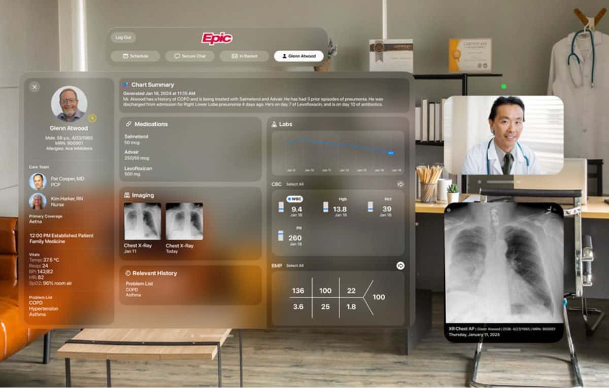 السجلات الطبية جزء أساسي من عمل أي طبيب، ولتسهيل كيفية التعامل معها، طوّرت Epic Systems وهي شركة متخصصة في تصميم السجلات الصحية الإلكترونية، تطبيق Epic Spatial Computing Concept خصوصًا لنظارة Apple Vision Pro للسماح للأطباء بإنشاء السجلات الطبية الخاصة بمرضاهم بسهولة، ومراجعة نتائج التحاليل في المختبرات، والتواصل مع المرضى باستخدام نظام دردشة آمن من خلال إيماءات بديهية.