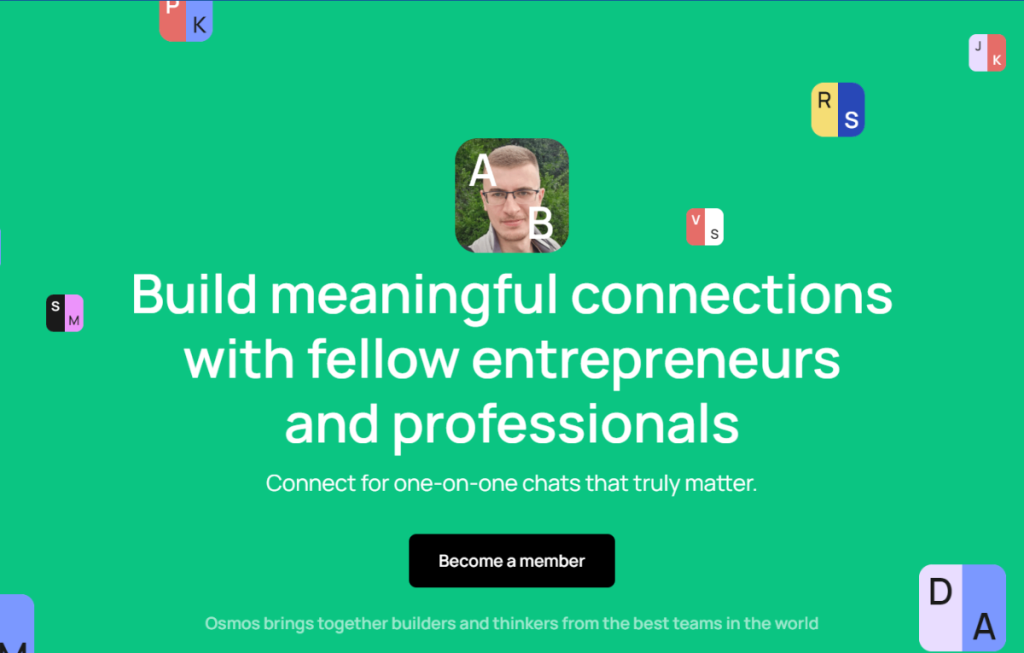 وتمتلك Osmos محرك التوفيق القائم على الذكاء الاصطناعي، وتوضح المنصة أن هدفها هو جمع المؤسسين والمستثمرين وكبار المديرين التنفيذيين والمطورين والمهندسين وقادة الفكر وغيرهم في قطاعات التكنولوجيا المالية ورأس المال الاستثماري والبرمجيات والتكنولوجيا التعليمية وغيرها من قطاعات التكنولوجيا.