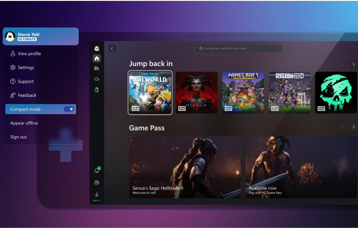 وقدمت الشركة وضعًا مضغوطًا لتطبيق إكس بوكس عبر نظام التشغيل ويندوز في العام الماضي، وهو مصمم لتوفير واجهة مستخدم بسيطة وسهلة، وخاصة عبر الأجهزة الصغيرة، مثل ASUS ROG Ally، أو الأجهزة المحمولة المماثلة التي تعمل بنظام ويندوز.