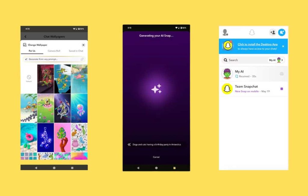 بدأت شركة سناب شات بإدماج المزايا المعتمدة على الذكاء الاصطناعي التوليدي في تطبيق سناب شات منذ عام 2023 حتى حصل التطبيق على مجموعة متنوعة من هذه المزايا، بعضها يساعدك في إنشاء محتوى مخصص، وهناك مزية تهدف إلى مساعدة المستخدمين في تخصيص واجهة الدردشة الخاصة بهم في التطبيق، وتُحسّن هذه المزايا تجربة استخدام التطبيق بنحو كبير.